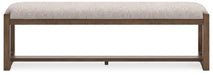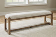 This dining bench sits comfortably at the intersection of modern lodge and farmhouse aesthetics. Your warm and welcoming disposition is reflected in its charming architectural elements and neutral textural fabric. Even with its poise, the bench remains practical. Its cushioned seat invites you to linger longer at the table, defining your dining room with reliable function and style.