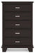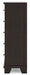 Feast your eyes on this richly versatile chest of drawers. Its traditional-inspired dark brown finish effortlessly blends with contemporary bright nickel-tone pulls to create a stunning look that's not too stuffy or too trendy. Spacious drawers offer plenty of storage for your wardrobe and spare bed linens.
