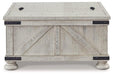 Double up on form and function with this square coffee table with storage. Its dual-lid tabletop provides easy access to the roomy storage space. Crafted with a distressed whitewash finish, crossbuck detailing and metal bracket appliques, this generously scaled coffee table is rustic farmhouse living at its best.