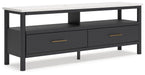 Imagine a TV stand that adds sophisticated and minimal boho style to your home with a stylish storage solution. This stand does just that. Its sleek design and replicated marble top create an upscale ambiance that's perfect for displaying your television and organizing your space.