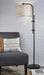 This floor lamp features a beautiful black finish that adds a striking accent to your living space. The lamp is elegantly curved with soft edges, and is adjustable to provide targeted illumination. Topped off with a crisp white drum shade, this lamp provides a subtle and appealing classic design wherever placed.
