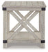 Add a quaint touch of farmhouse style to your living area with this end table. Its beautifully distressed light gray finish enhances the reclaimed wood's natural grain, which delivers a naturally aged feel straight from the countryside. You'll love its generous scale, offering a roomy table top and base shelf that are ideal for displaying accents and more. Large legs, metal accents and the planked effect dress up its country charm._x000D_