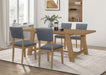 Bring modern farmhouse style to your dining room with this stunning dining table. The brown wire-brushed finish showcases the natural beauty of the wood, while the open, airy U-shaped legs and wide trestle base add a distinctive modern touch to the classic farmhouse look. Pair it with coordinating dining chairs featuring a light brown frame and blue linen-like fabric that pops against the natural finish.