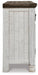 Have your fill of modern farmhouse style with this TV stand. Its distressed two-tone finish pairs a vintage white with a weathered gray for a look that’s utterly charming. Right and left cabinets open to reveal adjustable shelving for all your entertainment center storage needs. Center glass doors add to its relaxed appeal.